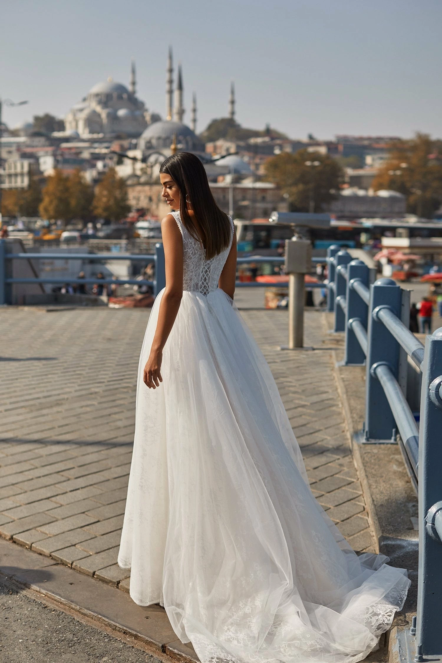 Romantic and feminine, you can’t go past the Ece Gown. Constructed from detailed lace fabric with a sheer tulle skirt overlay, pearl accents, and nude mesh inserts on the bust and sides. This gown is elevated with its lace-up back for a classic finish.