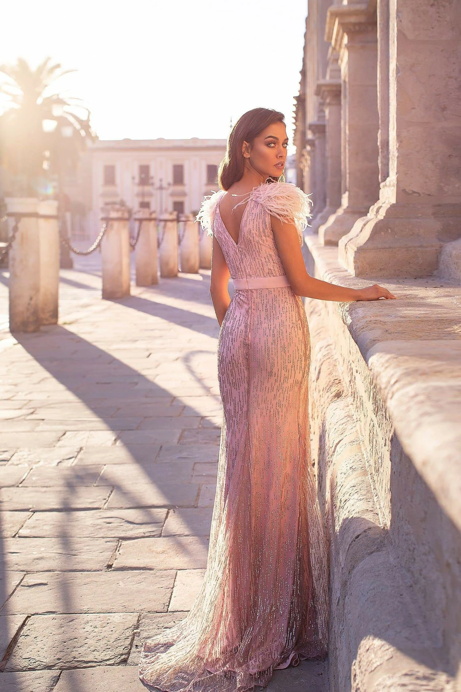 Fall in love with Elanur, the incredible new pretty-in-pink gown that will turn heads at your prom. Be the envy of every girl with pink glitter fabric all over, a plunge V-neck for a hint of sexy & faux fur shoulders. Made from stretchy fabric with mesh lining.