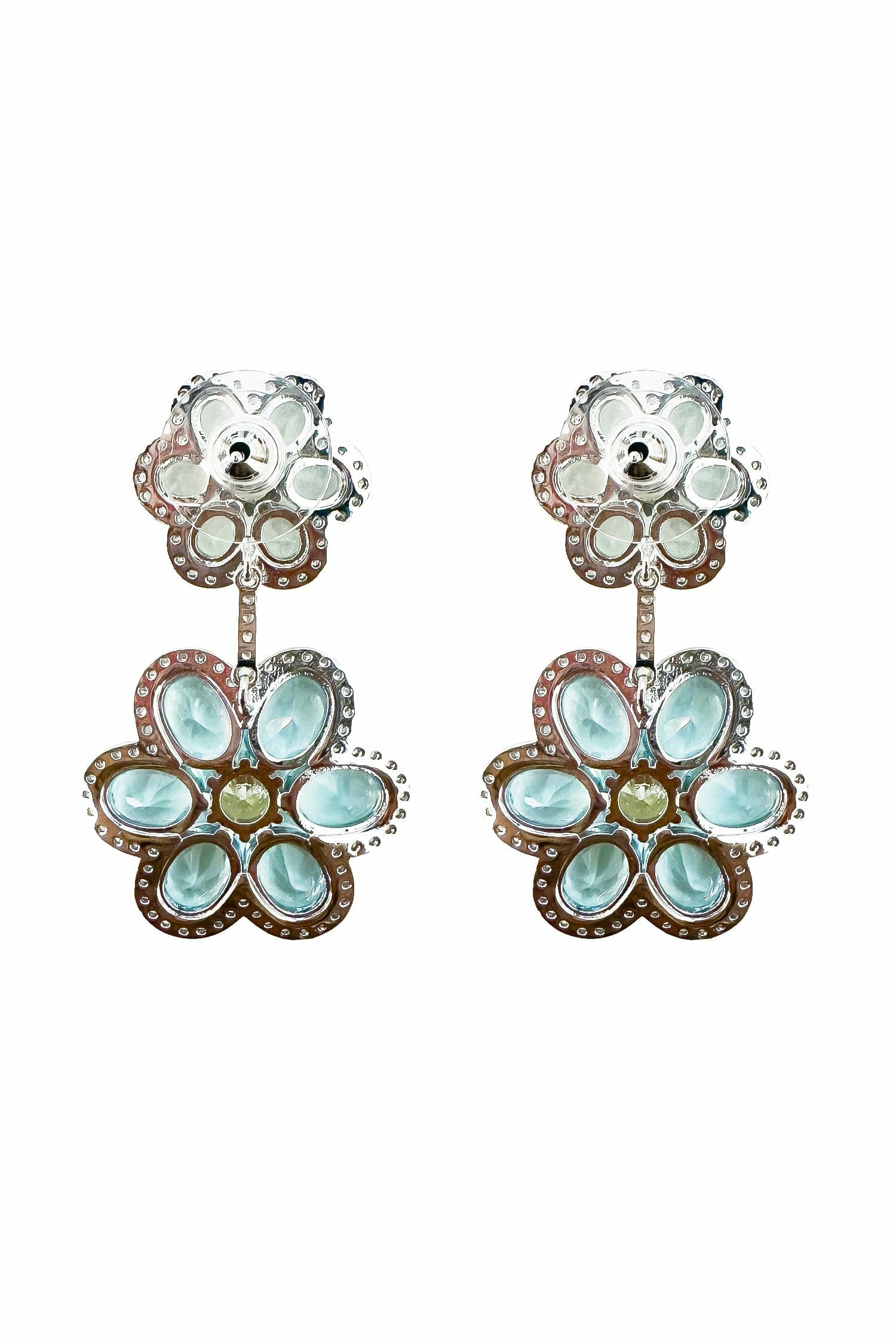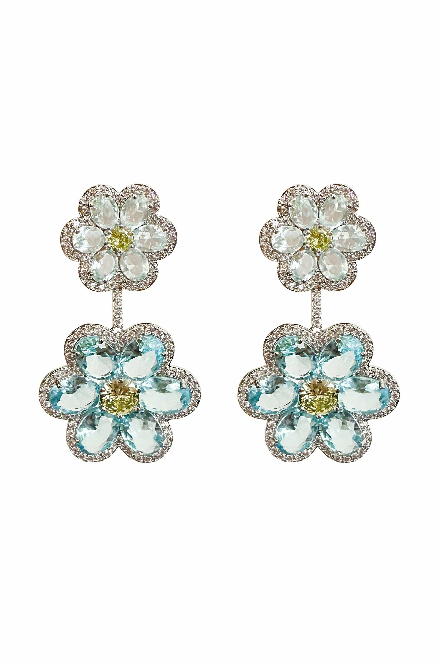 The Faretti Earrings are bound to draw attention with any look. Rendered from silver hardware and encrusted with an array of blue gems and a diamante trim. This design features a delicate flower design for a feminine aesthetic.
