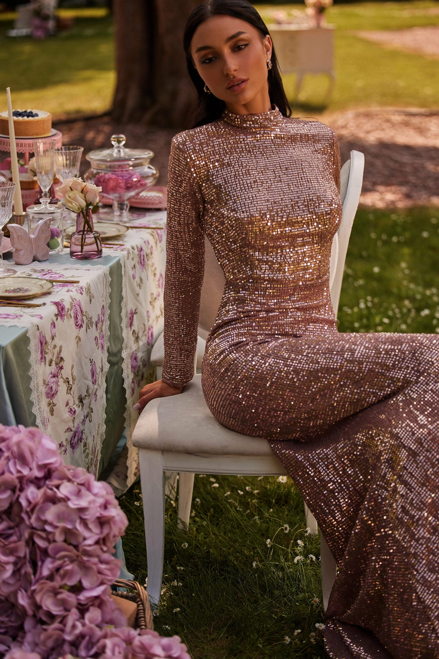 The Heather Gown delivers a simplistic design to allow all the attention to focus on your silhouette. Cut from a glistening sequin fabric in a feminine rose gold tone and elevated by its sophisticated high neckline, long sleeves and mermaid train. The Heather Gown is sure to turn heads.