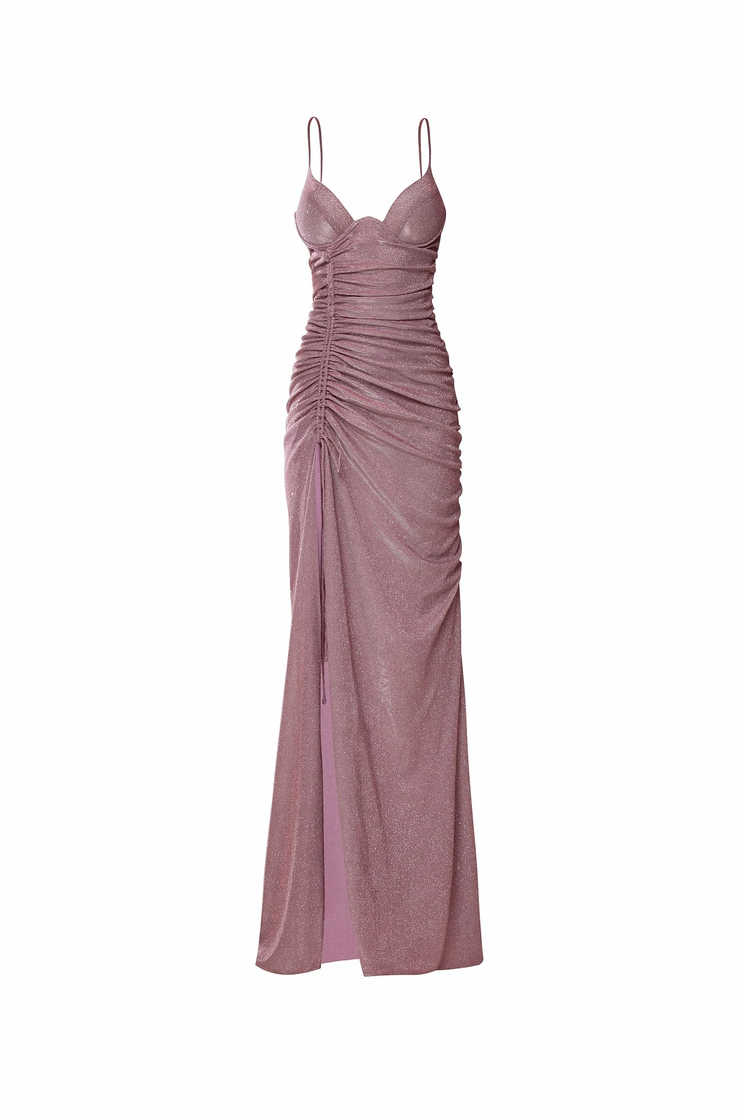 The Henriette Gown provides an innate understanding of the female form with its fitted silhouette, ruched detailing & side slit. Rendered from a glitter lurex fabric in a feminine lilac tone. The Henriette Gown will lend a stylish touch to your evening wear.