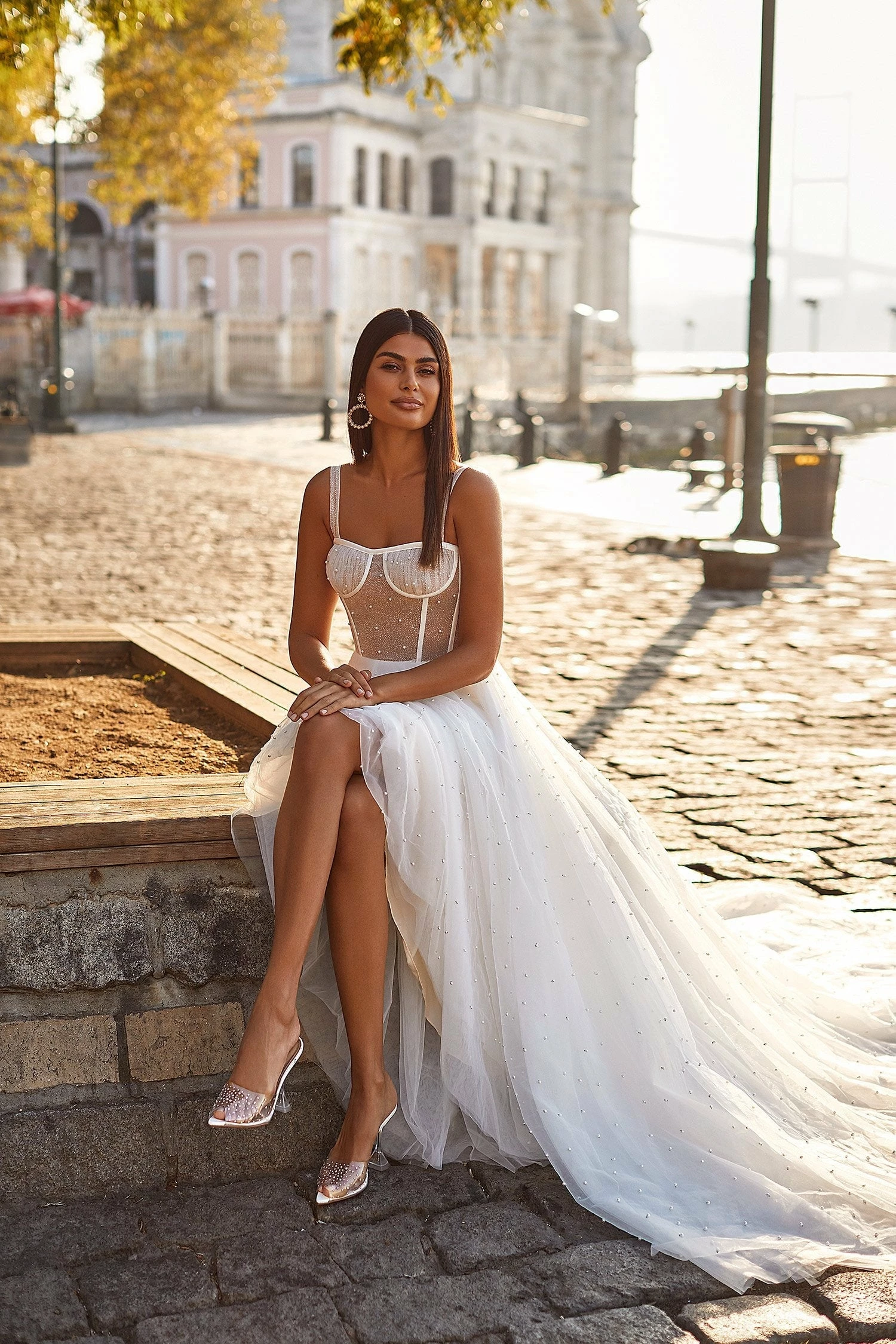The Jubaila Gown is the perfect median for those brides that want a traditional look with added modern design elements. Rendered from a delicate tulle fabric adorned with pearls and adjusted with a lace-up back, these details bring out a conventional look for your special day while still adding the sheer bodice and ruched bust to accentuate the contemporary taste.