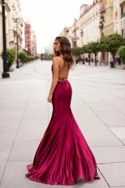 The perfect white gown. Julianne is an effortlessly stunning gown that will have you feeling like a goddess. Features a plunge V-neckline, middle slit and thin straps that can be tied multiple ways around the back / waist. This mermaid gown is made from stretchy crepe fabric for a comfortable fit.