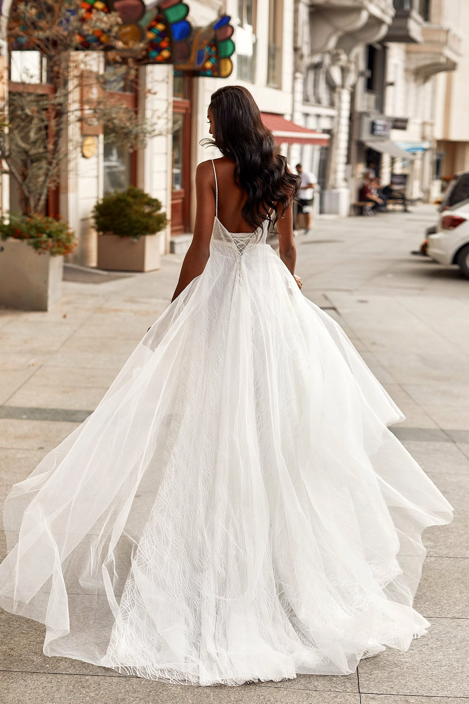 Look flawless on your special day in the Karla Gown. This gown features a v-neckline, low back with lace-up detail & an a-line skirt. Suspended from dainty beaded straps, it’s all about the finer details in the Karla Gown.