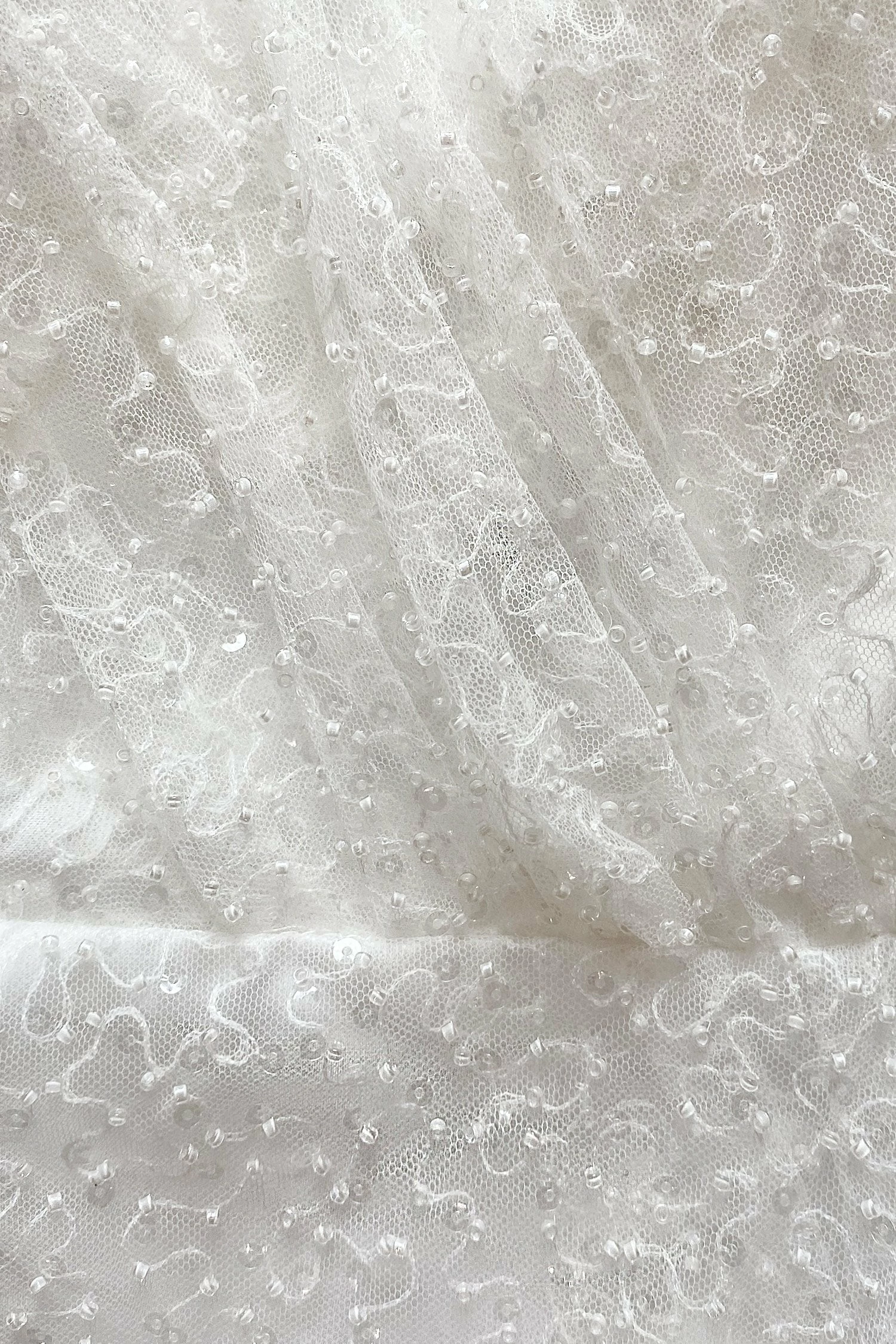 Leslie is comprised of a polyester underlay, sheer tulle layer & beaded delicate mesh top layer. Padded cups with boning. No stretch & non sheer. Left leg side slit.