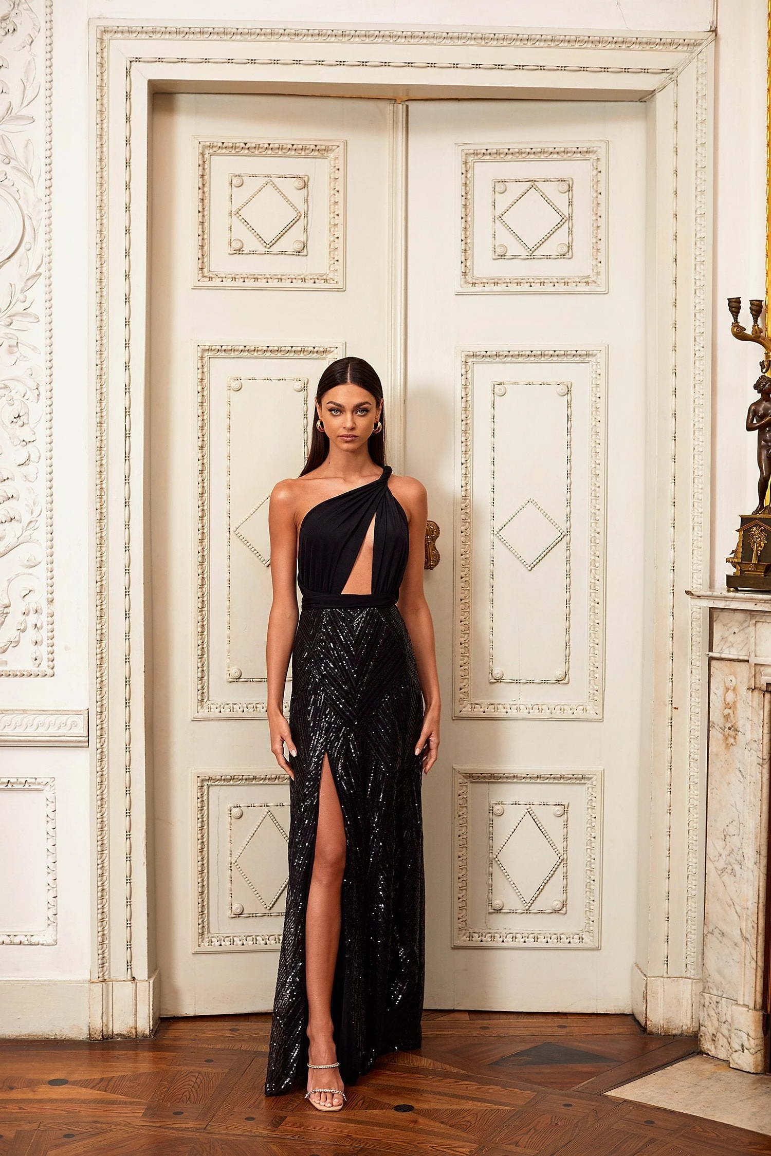 Alluring yet elegant, the Maria Dress epitomizes modern formal wear. This dress is crafted from both a super-stretchy jersey fabric and a patterned sequin fabric to appropriately suit the different contours of the body. It has a multiway top so you can adjust it to compliment your personal look. This dress features an open back, thigh-skimming slit & straight fitted silhouette. Wear it your way with the Maria Dress.