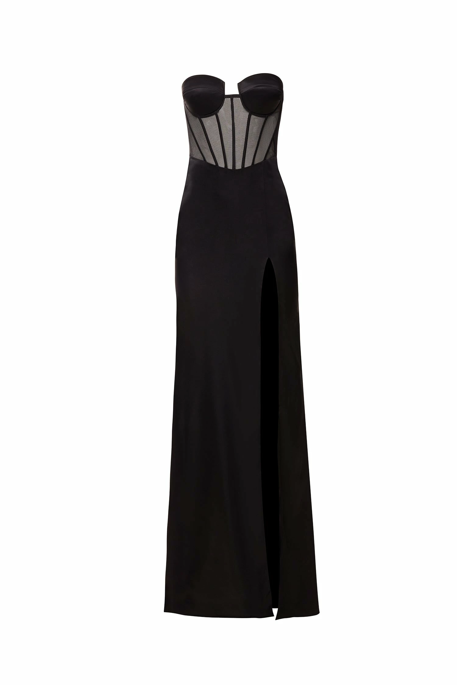 Invest in modern sophistication with the Marilyn Gown. Formed with a sheer mesh bodice with a strapless neckline and elevated with its simple silhouette that fits at the waist and drops to a straight fit. This chic black satin design provides effortless glamour to your evening attire.