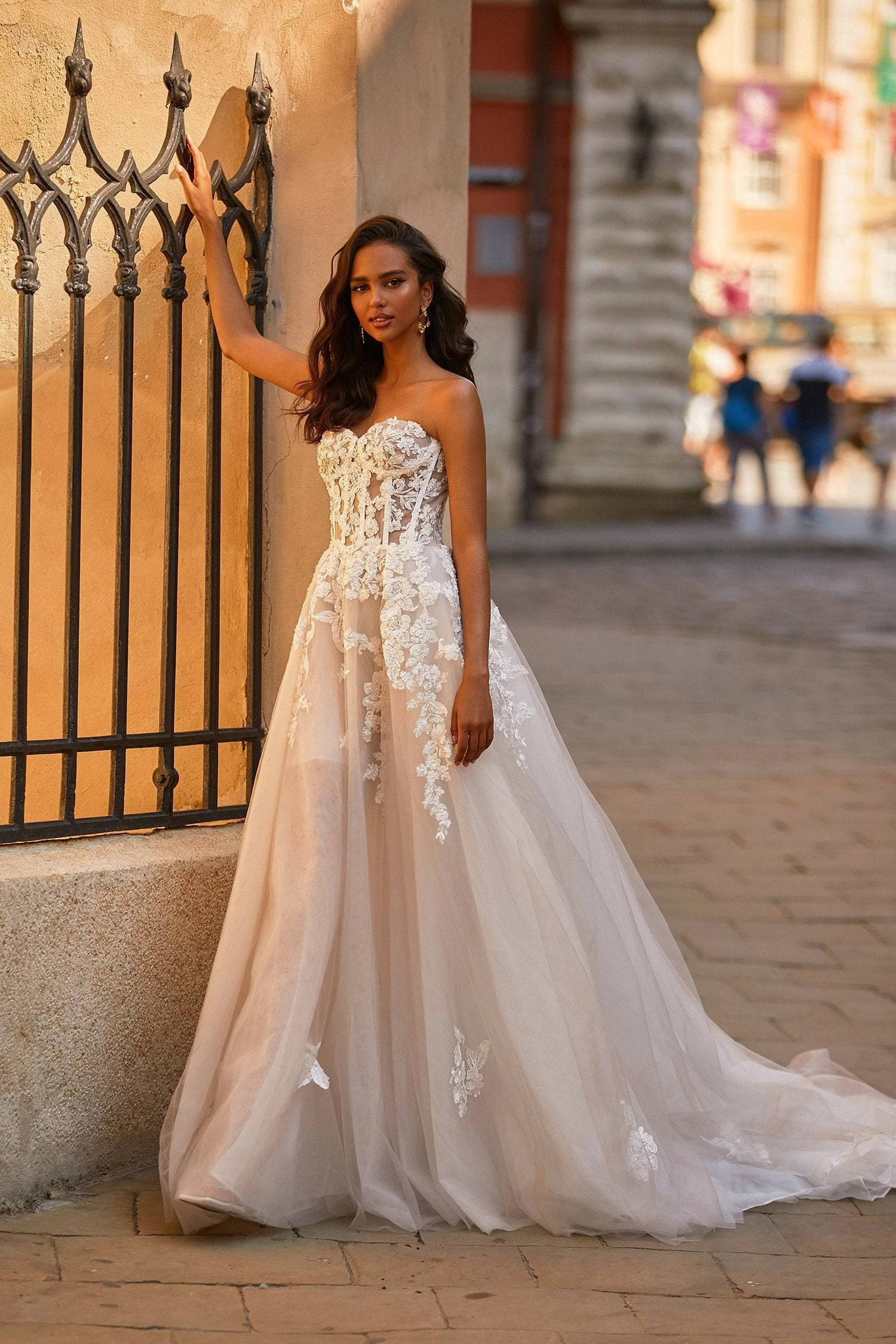 The Marisel Gown is so dreamy and breathtaking & will make your wedding day unforgettable. Completed with a strapless structured bustier covered in embellishments & beading details. Marisel also has a semi-sheer tulle a-line skirt with mini skirt lining underneath.