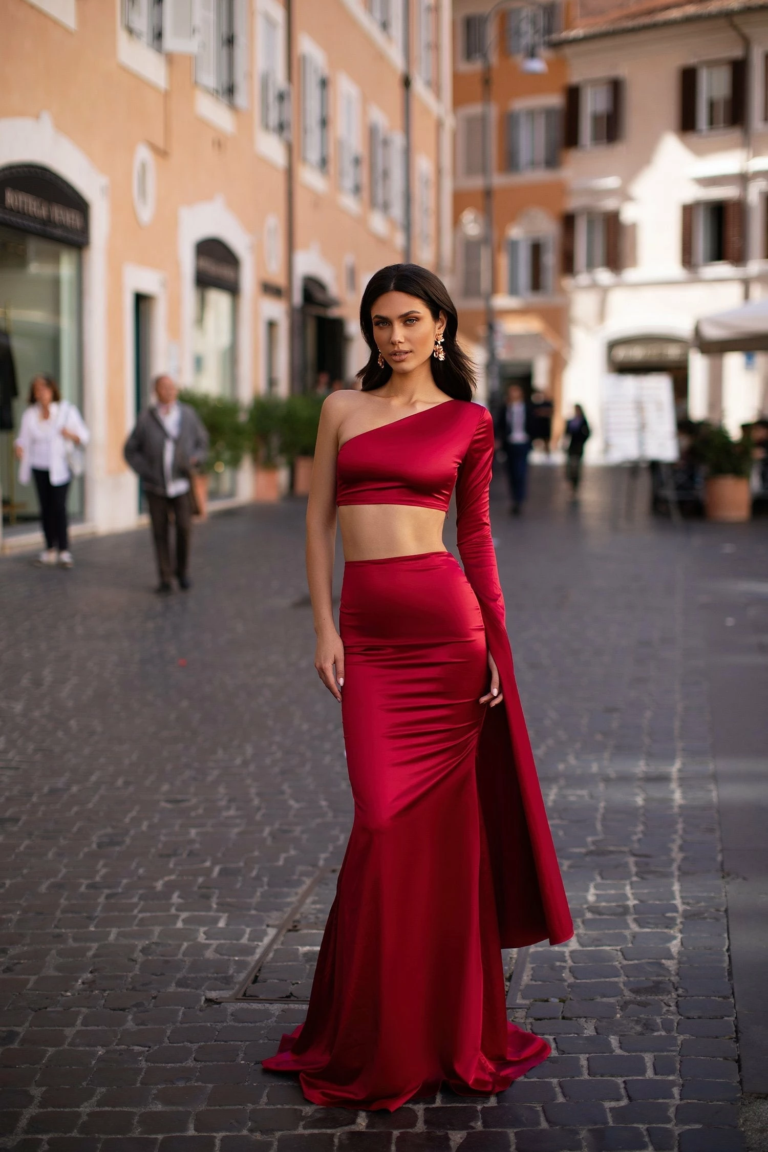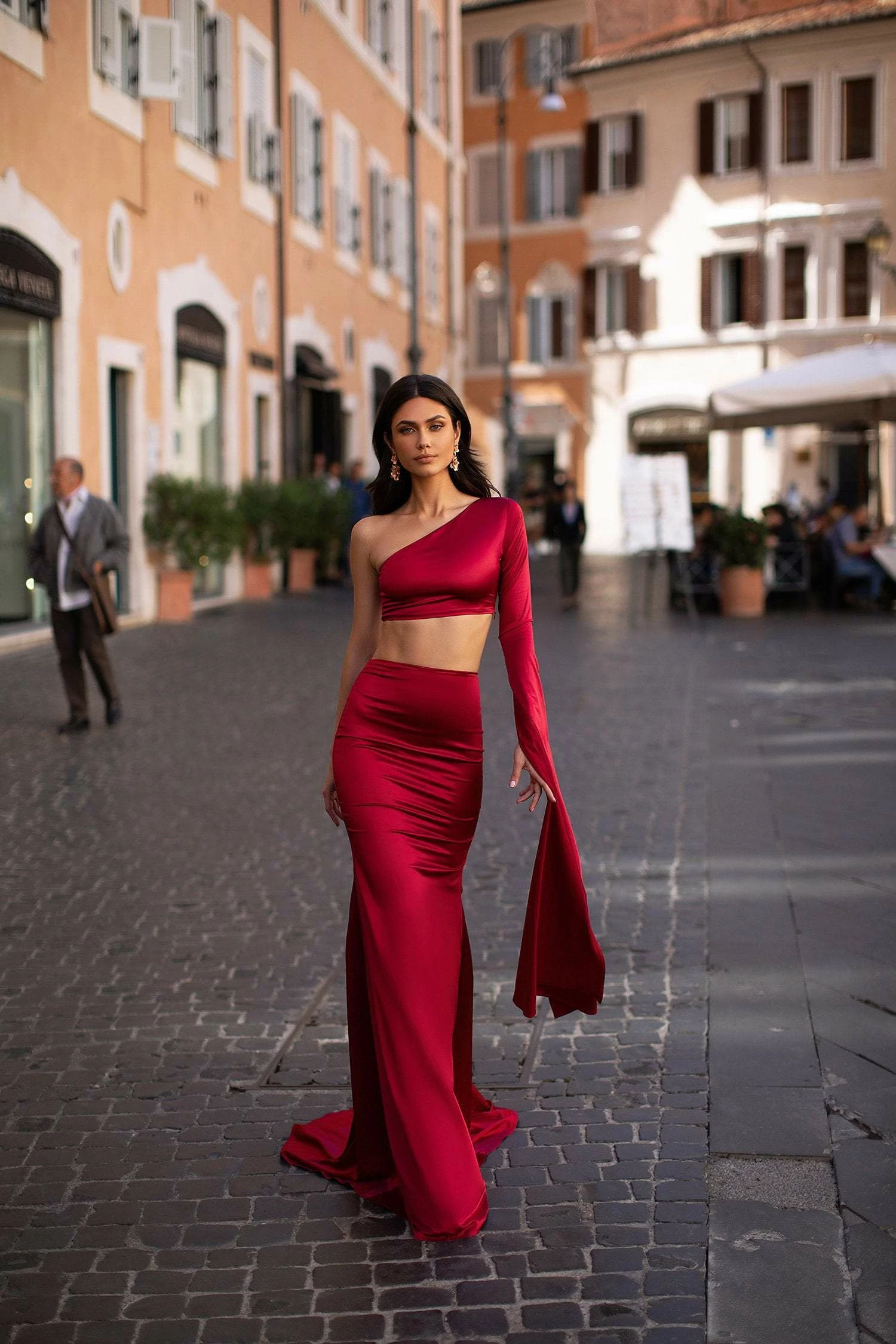 This modern two-piece design will captivate onlookers. Miya is made from silky red satin & features an asymmetrical one-shoulder long flare sleeve with ruched detailing on the back skirt.