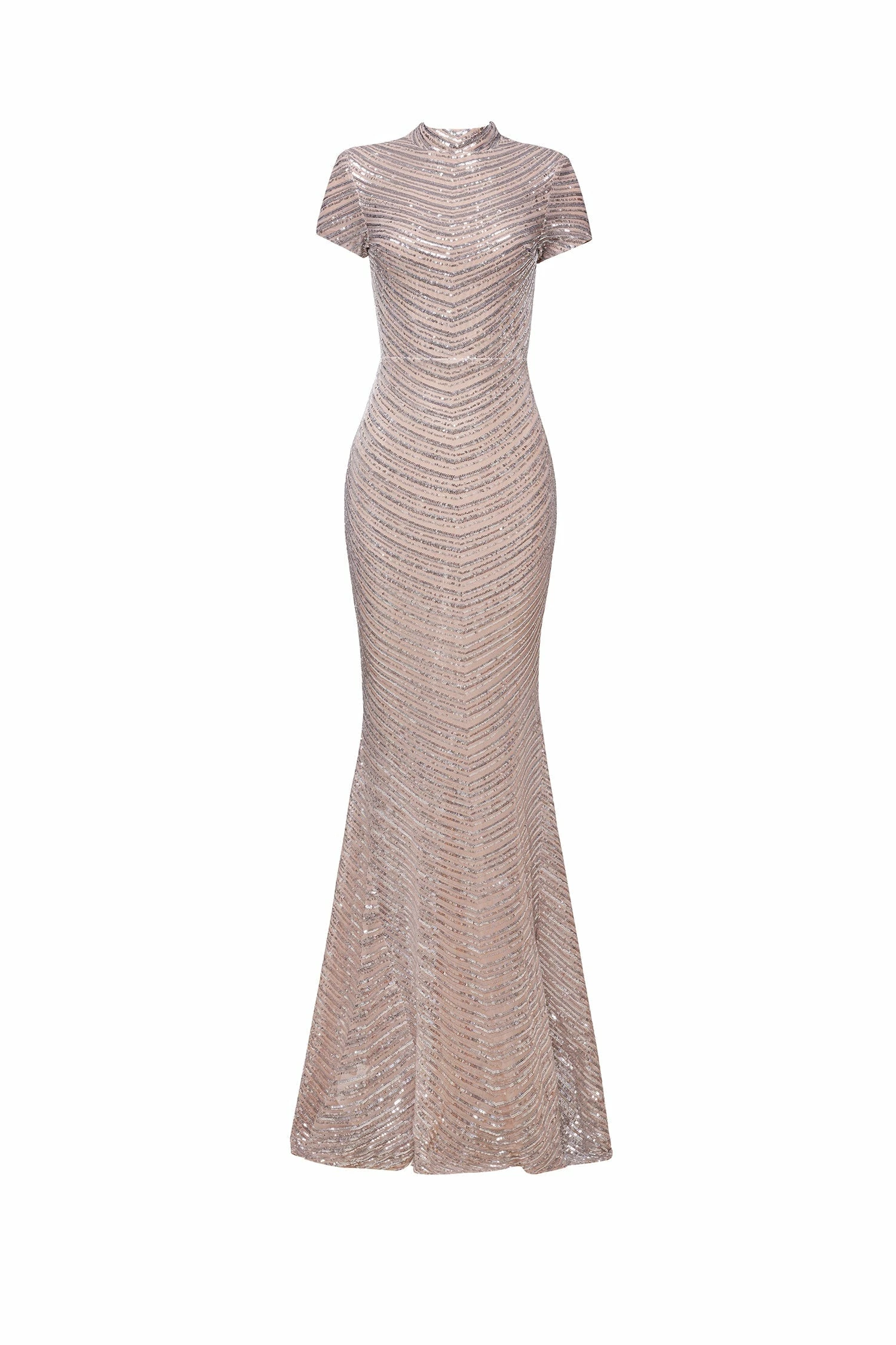 The Ofelia Gown is the epitome of chic glamour. With a high neck, short sleeves, and an open back, this silver sequin gown blends a contemporary fabric with a classic design for a stylish look.