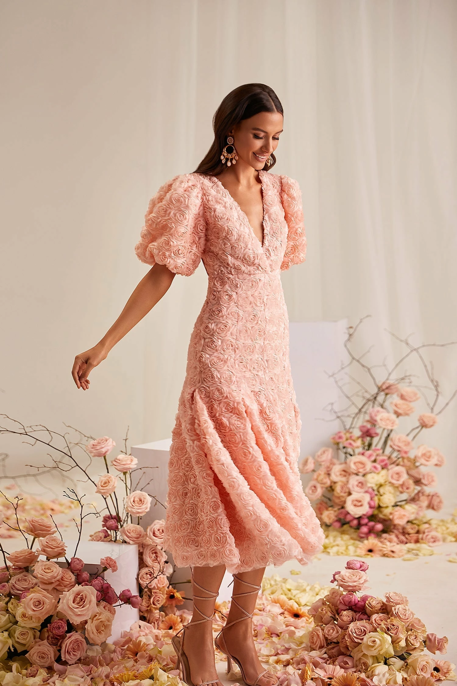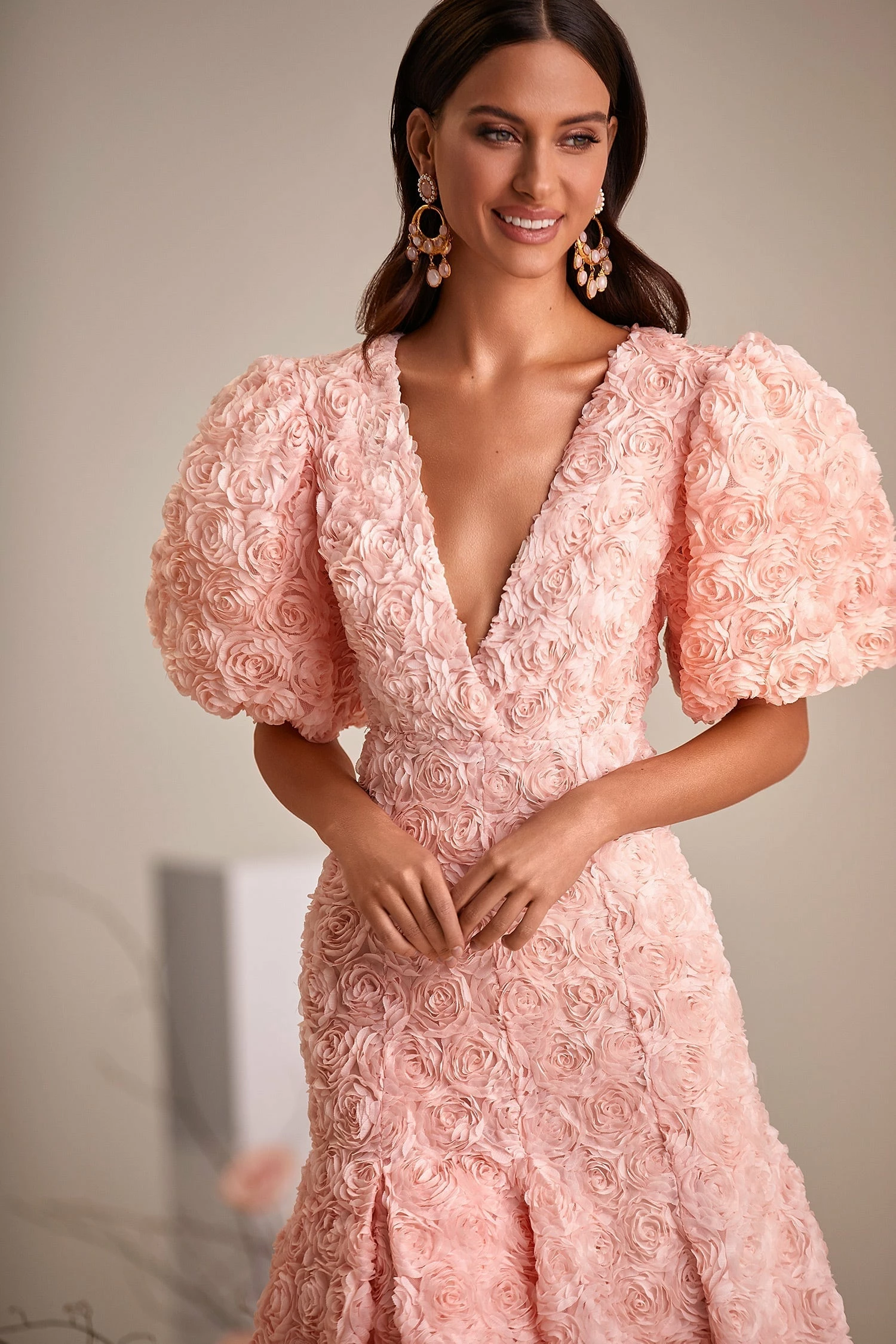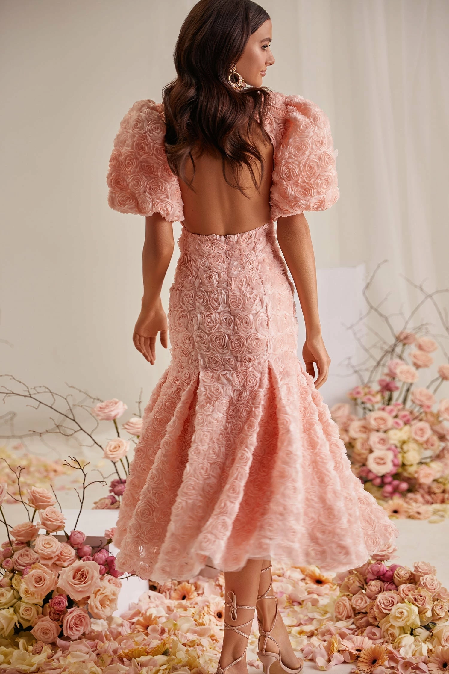 The Simona Dress offers an elegant take on evening styling. Rendered from a luxurious 3D floral fabric and elevated with an open back that is fixed with a button clasp, a full pleated skirt with a side slit, and puff sleeves. This soft coral color allows a sense of understated glamour to take control of your look.