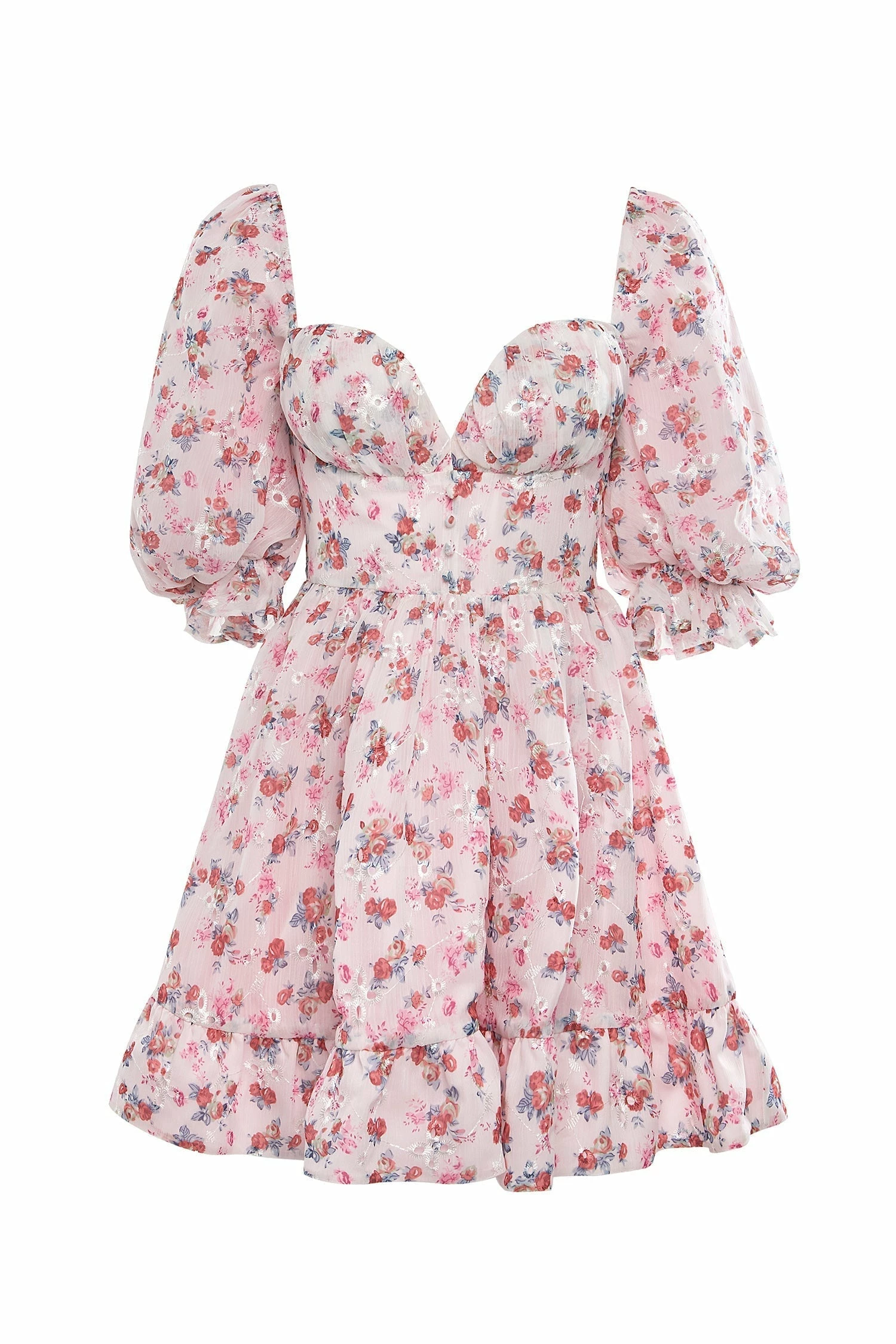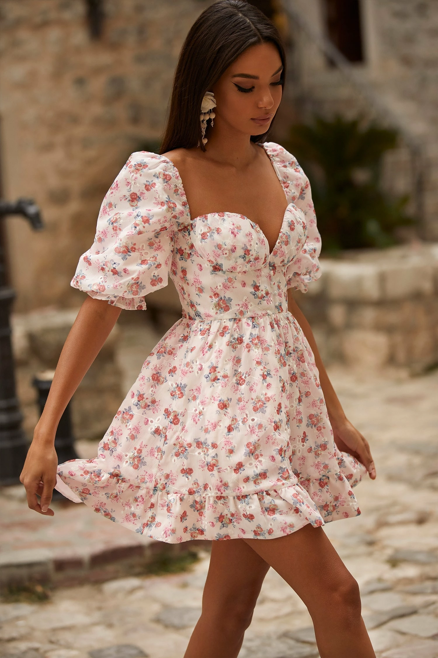 The Triana Dress is the sweetest mini that can easily be packed away for your next vacation. Crafted from a light pink floral patterned fabric with a sweetheart neckline, puff sleeves, and dainty buttons that cascade down the torso. The Triana Dress is fitted with an a-line silhouette with a bottom skirt frill to add volume to the overall look.